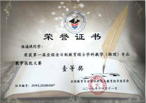 2016级全日制教育硕士学科教学(物理)专业学生张瑞琪获一等奖(指导教师杨英、罗海军),徐子雁获二等奖(指导教师杨英)的好成绩。