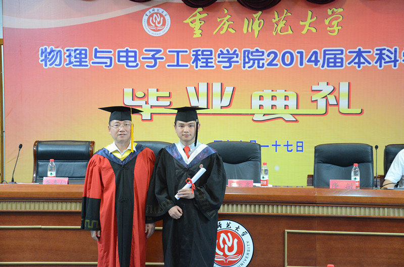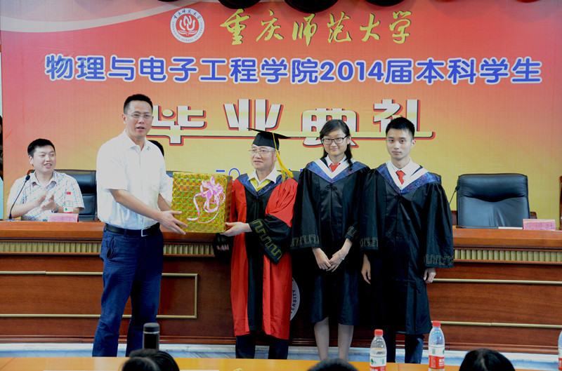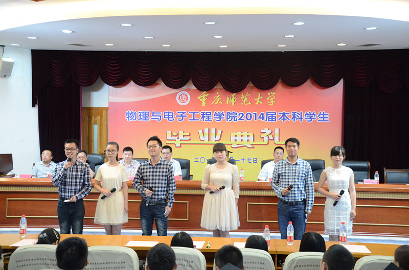 在同学们的热烈欢迎下,学院党委副书记冉久飞老师宣读了《关于表彰2014届优秀(良)毕业生的决定》并宣布表彰名单。学院学术委员会委员、学院党委书记唐敏老师宣布了对物理学(师范)专业史海洋等141人、电子信息科学与技术专业张念等96人、电子信息科学与技术(职教师资)专业王良刚等等76人,共计313名符合授予学士学位条件的2014届毕业生授予学位的决定。
