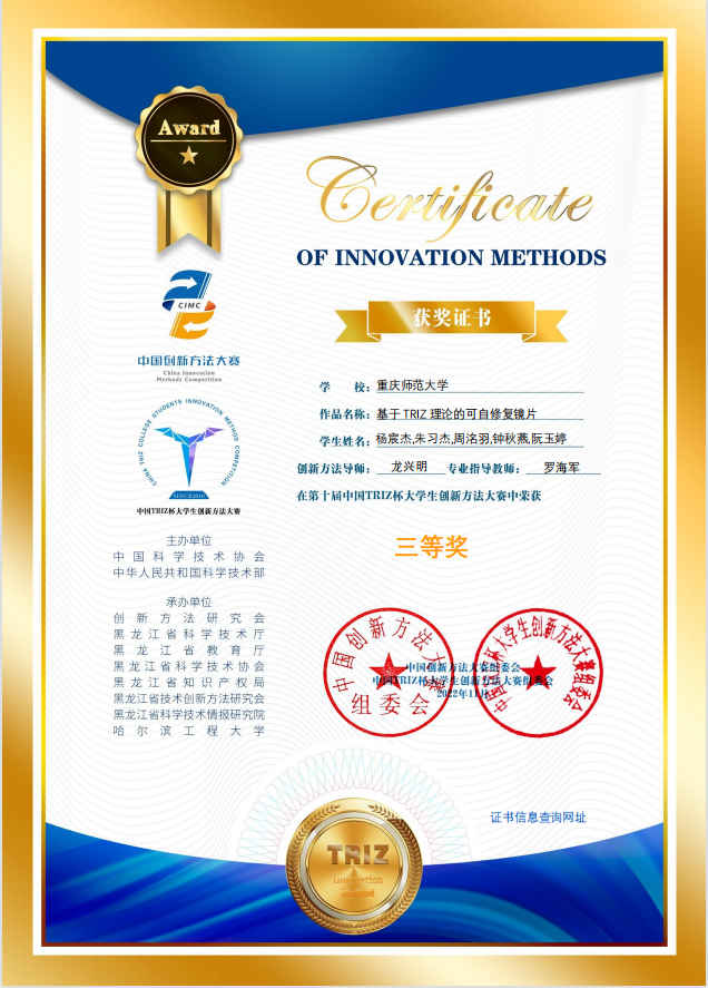 学生刘倩妤、杨宸杰等两个团队获得重庆市一等奖(晋级国家级比赛);冯秀亮、王康宇、任柏年、黄静怡等四个团队获二等奖;赵之瑞、陈桂馨、张佳雯、王莹莹、吴雨航、洪敏等六个团队获三等奖;学校被授予“重庆市triz创新方法比赛优秀组织单位”,杨英和龙兴明两位老师被评为重庆市级比赛优秀指导教师。晋级参与国家级比赛的两支参赛队伍,均获得三等奖,学校被科技部授予“第十届中国triz大学生创新方法大赛”优秀组织单位;杨英老师被评为“第十届中国triz大学生创新方法大赛”优秀联络员。