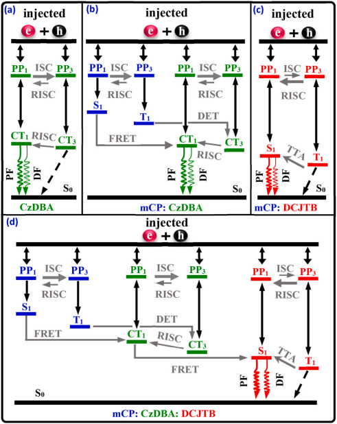 课题组以CzDBA作为热活化延迟荧光(TADF)敏化剂,系统研究了其在mCP主体中敏化DCJTB红光发射的微观机制。通过MEL技术,首次观察到器件在不同电流与温度条件下出现RISC→ISC→RISC的动态转换行为,揭示了直接电荷捕获与级联能量转移(Förster/Dexter)之间的竞争关系。该研究为设计高效率红光OLED提供了重要的物理见解与材料优化思路。