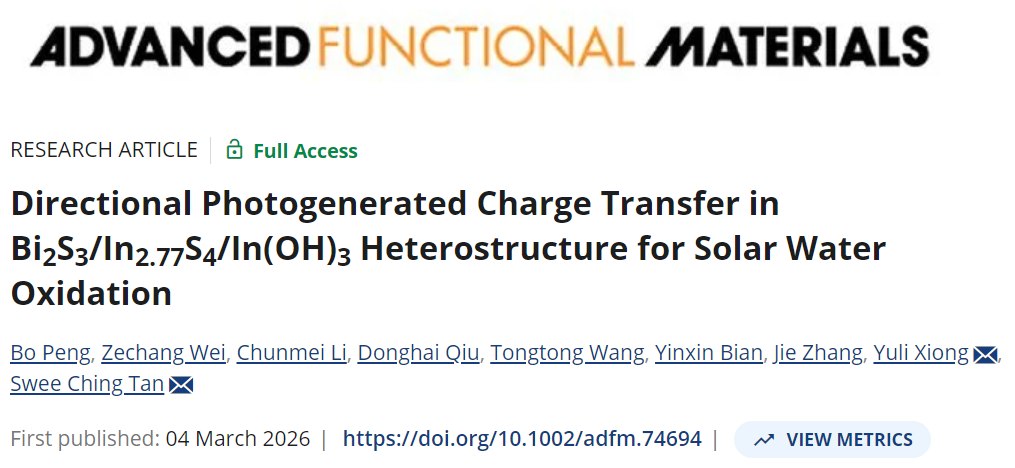 近日,《Advanced Functional Materials》(中国科学院一区TOP期刊)刊发了我校物理与光电工程学院新型磁电功能材料与器件课题组题为“Directional Photogenerated Charge Transfer in Bi2S3/In2.77S4/In(OH)3 Heterostructure for Solar Water Oxidation”的研究论文。我校研究生彭波为论文第一作者,h韩漫
