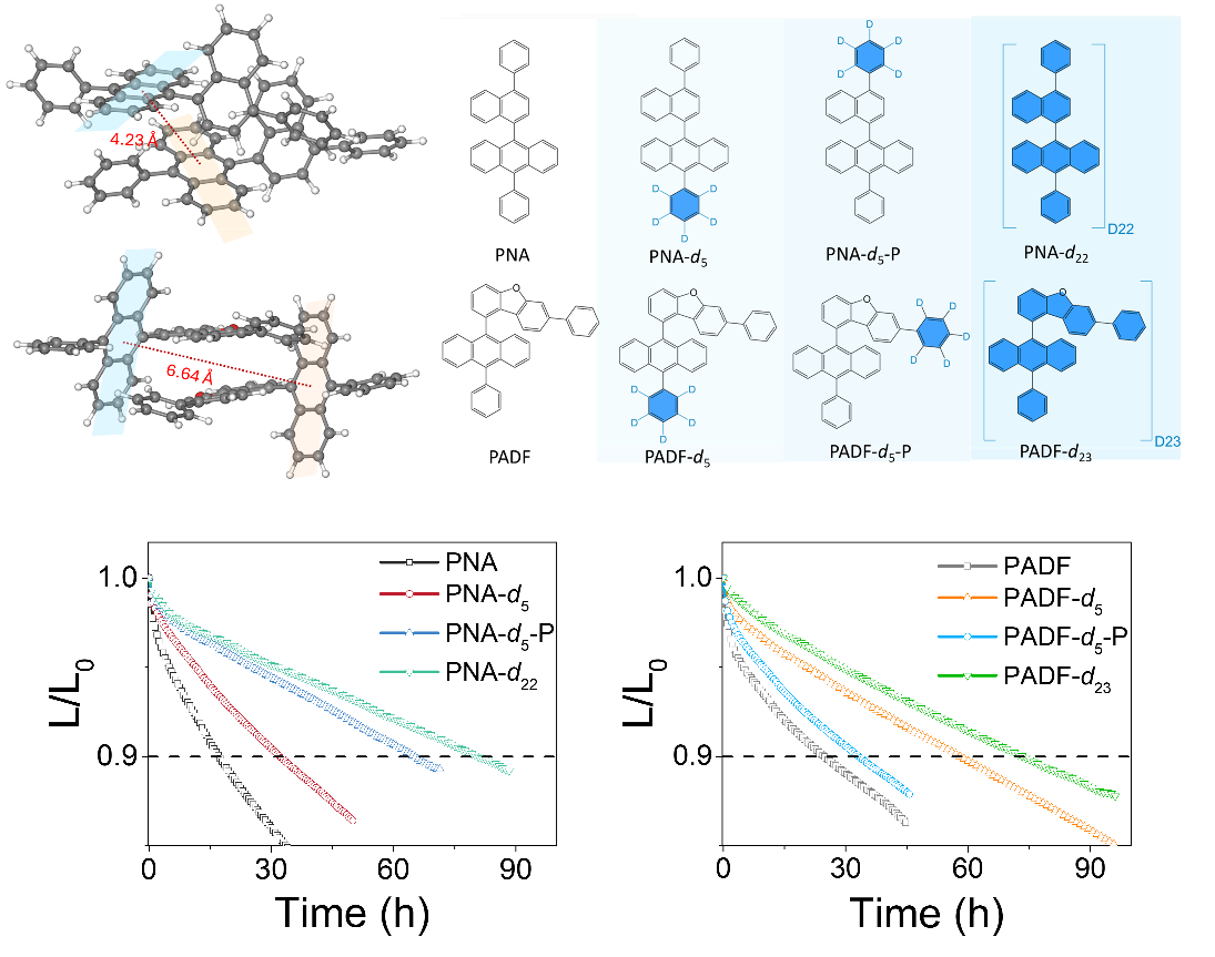 近年来,有机发光二极管(OLED)已成为主流的高端显示技术,但蓝光OLED的器件寿命不足仍是制约其高性能化、产业化发展的重大挑战。采用氘取代的有机材料,可利用碳-氘(C-D)键的振动频率低于碳-氢(C-H)键的特性,减缓材料降解的化学反应速率,从而提升材料的稳定性。然而,这一技术的内在作用机制,尤其是材料氘取代位置与器件稳定性之间的构效关系,目前仍不清楚。