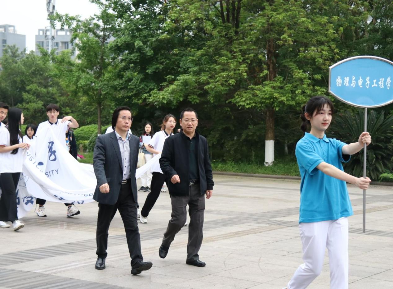 上午八点半,运动场上彩旗飘飘,锣鼓喧天,观众台上座无虚席。伴随着歌曲激昂的节奏声,彩旗队的成员们迈着坚定有力的步伐向我们迎面走来,他们身姿昂扬,步伐铿锵。紧随其后的是由各学院师生组成的方队,老师们精神抖擞,同学们意气风发,只为展示出学院的风采。在这精彩纷呈的时刻,各学院的表演都结合专业特点,挖掘专业内涵,融合专业精华,彰显专业魅力,既有专业的体现,又有文化的内涵,更有时代的理念,让观众们欣赏到了一场场美妙绝伦的演出。物电方阵的同学们以整齐的仪容,饱满的精神走在田径场上,充分展现了h韩漫