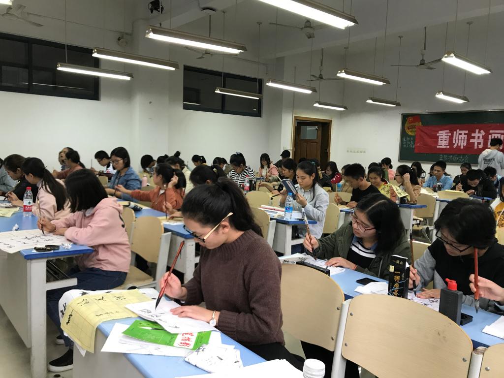 大家纷纷拿出自己的笔墨纸砚小心翼翼地在桌上摆好,但却在握笔姿势上犯了难,书画协会会长庞玉及教学部部长豆衡兴在教室中一个个指导有问题的同学。同学们或是需要纸张,或是不知如何运笔写某个笔画。他们都耐心地一一为其解答。古人讲究修身养性,所求无非心静。而写字最能让人静心。刚开始,还不时有人感叹自己写的字不如人意。反复叹息后便又写了起来。慢慢的,大家都投入到写字当中,聚精会神。全场鸦雀无声。蘸墨、挥笔的动作做了一遍又一遍也不见有人烦。即便是其他教室传来的充满激情的音乐声也无法打破这种安静。在此时,大家都进入自己的世界,用传统的方式见证着自己的进步。