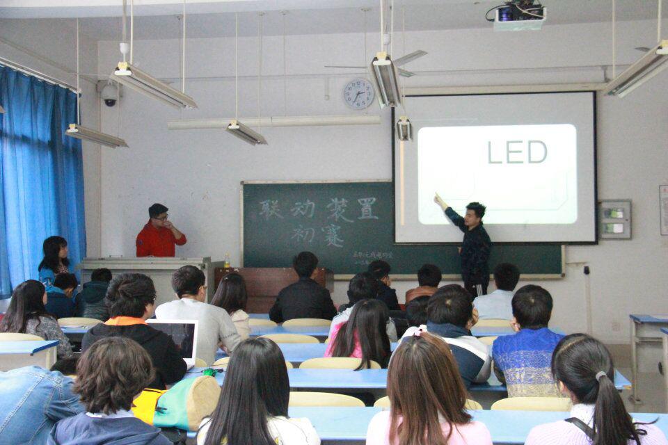 物电学院特此举办了来自其学院的特色活动——联动装置竞赛。活动主办方无线电协会在2015年4月9日下午两点于弘德楼开展了联动装置大赛的初赛选拔。参加本次活动的嘉宾有科技部部长向承琼,社团部周立伦,学习部向优生,上一届获奖队伍代表王川东。