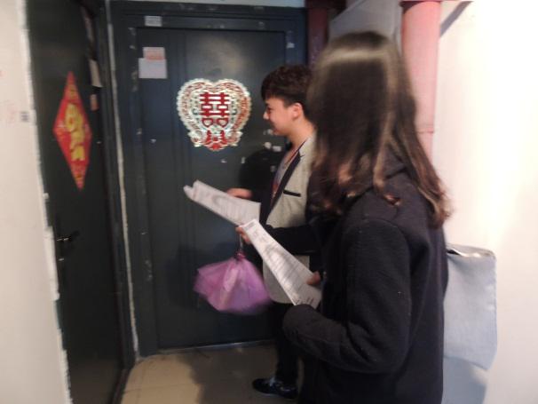 ‘爱心家教’志愿者……”——礼貌的用语,得体的动作无不说明“爱心家教”活动的纯粹,也彰显了各位“老师”们的高素质,为“师能”的门面无形中做了宣传。由于“爱心家教”并不是第一次开展辅导活动,在宣传的过程中遇到一些“老客户”难免欣喜,或者是爷爷奶奶在家的,志愿者们耐心为其解释,了解到免费服务之后也有不少居民答应会去看看。