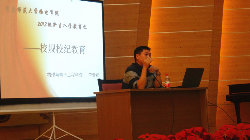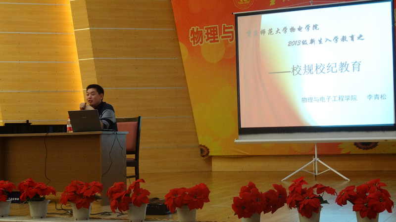 于2013年9月27日晚上7:00在校友会堂音乐厅举行了“校规校纪解说”讲座,学院团总支副书记李青松,2013级辅导员邓娜、陈禹辛老师到场和全体2013级新生参与此次活动。主讲人为李青松老师。