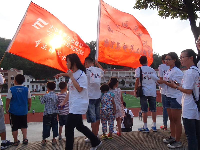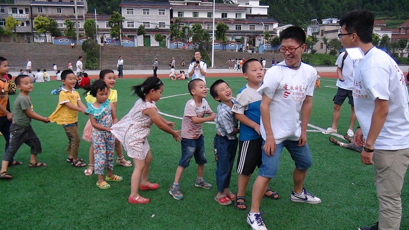 下午19:00,伴着凉凉的晚风,队员们挥舞着队旗来到乡上乡民们傍晚集中娱乐的活动场所——足球场进行活动开展的宣传工作。这一次的主要工作是先对大木乡聚居的乡民人数进行估计,向乡民宣传明天在乡政府即将开展的“小桔灯”爱心家教服务和家电维修服务。为了吸引家长与朋友们的眼光,大家在足球场上做起了简单的小游戏。随着时间的流逝,小朋友们不再对大家那么陌生而是参与进来一同玩耍。最后,大家约定好准时参加明天在乡政府会议室的家教活动。在此次出行中,队员分成各个小组并指定出带队组长,有的小组拿上相机记录下每一个动人的瞬间,有的小组带上问卷调查表进行主题调查活动,有的小组则向居民讲解此次队伍的活动目的、意义并邀请他们积极参与。