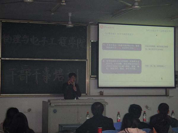 党总支副书记冉久飞老师对何东教授做了隆重的介绍,并对参加培训的同学提出嘉奖。冉久飞老师指出,任何一项微小的收获背后都有巨大的付出,当别的同学在休息、放松的时候,参加培训的同学却要坐在教室里接受培训,大家可能觉得很疲惫,但一定会有所收获,一定会在培训过程中有所感悟,这就是作为一名学生干部要比其他同学多付出和多收获的地方。接下来,何东教授就《学生干部的成才及人文素养》做了精彩的阐述。