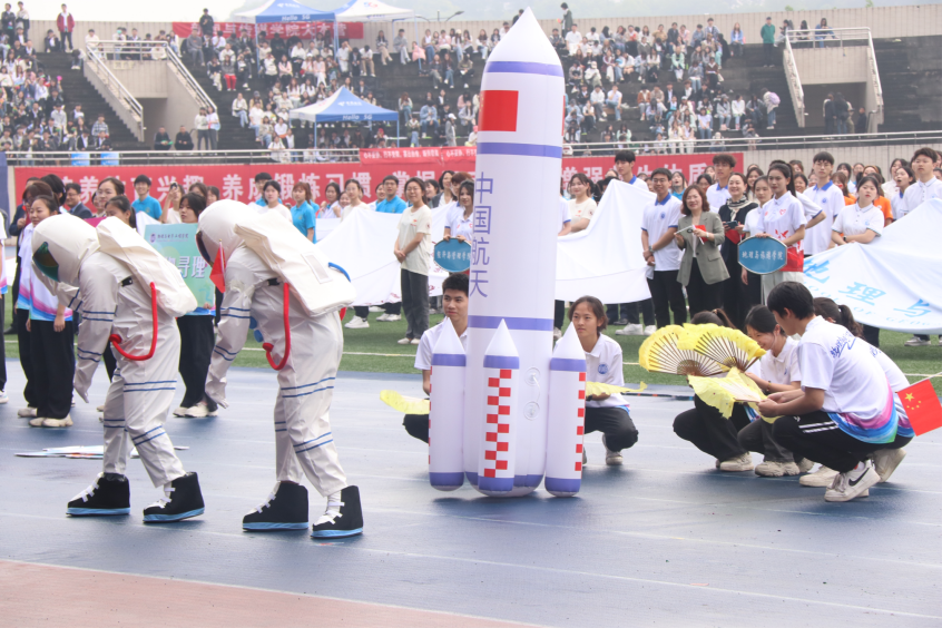 师生方阵身着统一服装,步伐矫健,神采飞扬,教职工手中的国旗迎风招展,学生们高举院牌,高喊“格物寻理,追电逐光,驰骋赛场,物电最强”,威武的口号掷地有声,彰显出物电师生坚定的信念与昂扬的斗志。更为引人注目的是,物电学子手举火箭模型,身穿宇航员服,展现出对科学探索的热爱与追求。近年来,物电学院在人才培养、教学科研、学科建设等方面取得累累硕果。全院师生齐心协力,为物理学专业申博工作努力拼搏,火箭模型象征着物电人一飞冲天的梦想。