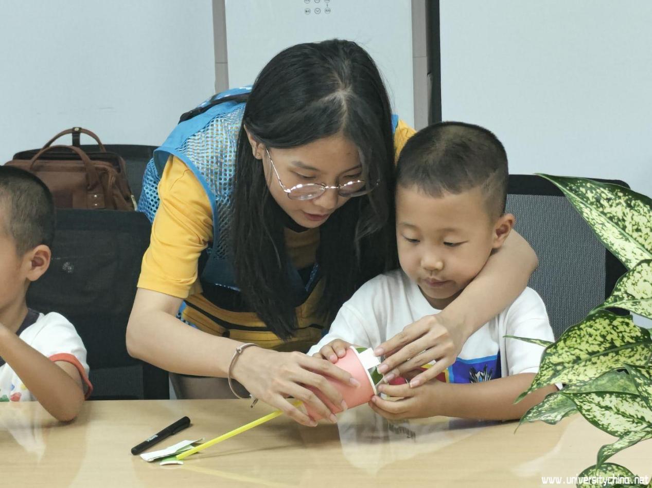 志愿者辅助小朋友完成“纸杯爪子”制作