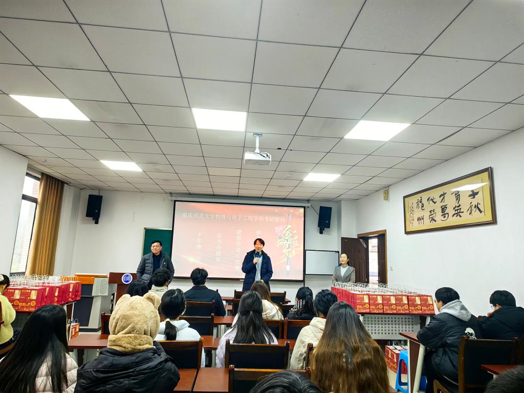 党委书记杨云代表学院向全力冲刺考研的学子们表达了关心问候。他表示,考研是一场漫长且艰辛的修行,同学们能够坚守备考初心、克服重重困难,展现出了物电学子坚韧不拔、勇攀高峰的良好风貌。他叮嘱同学们,在最后冲刺阶段,要科学规划复习时间,注重劳逸结合,合理调节心态,既要全力以赴备战,也要照顾好自身身心健康;同时要树立积极乐观的备考信念,相信自己的付出终将有回报,学院永远是大家最坚实的后盾,会全力为大家解决备考过程中遇到的各类问题。