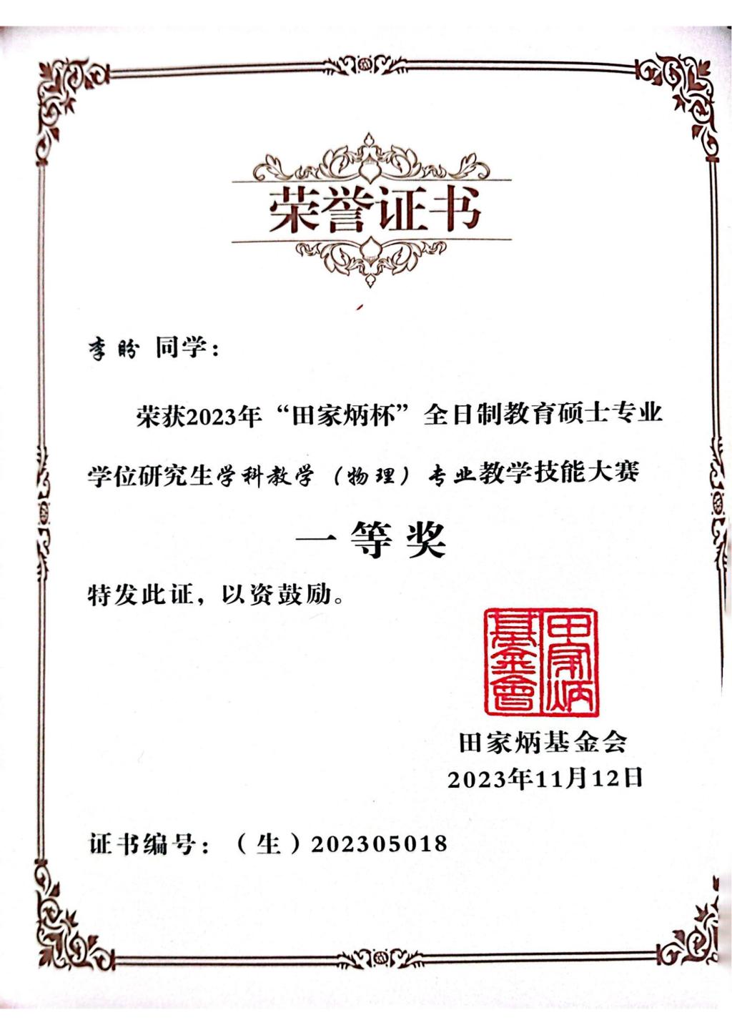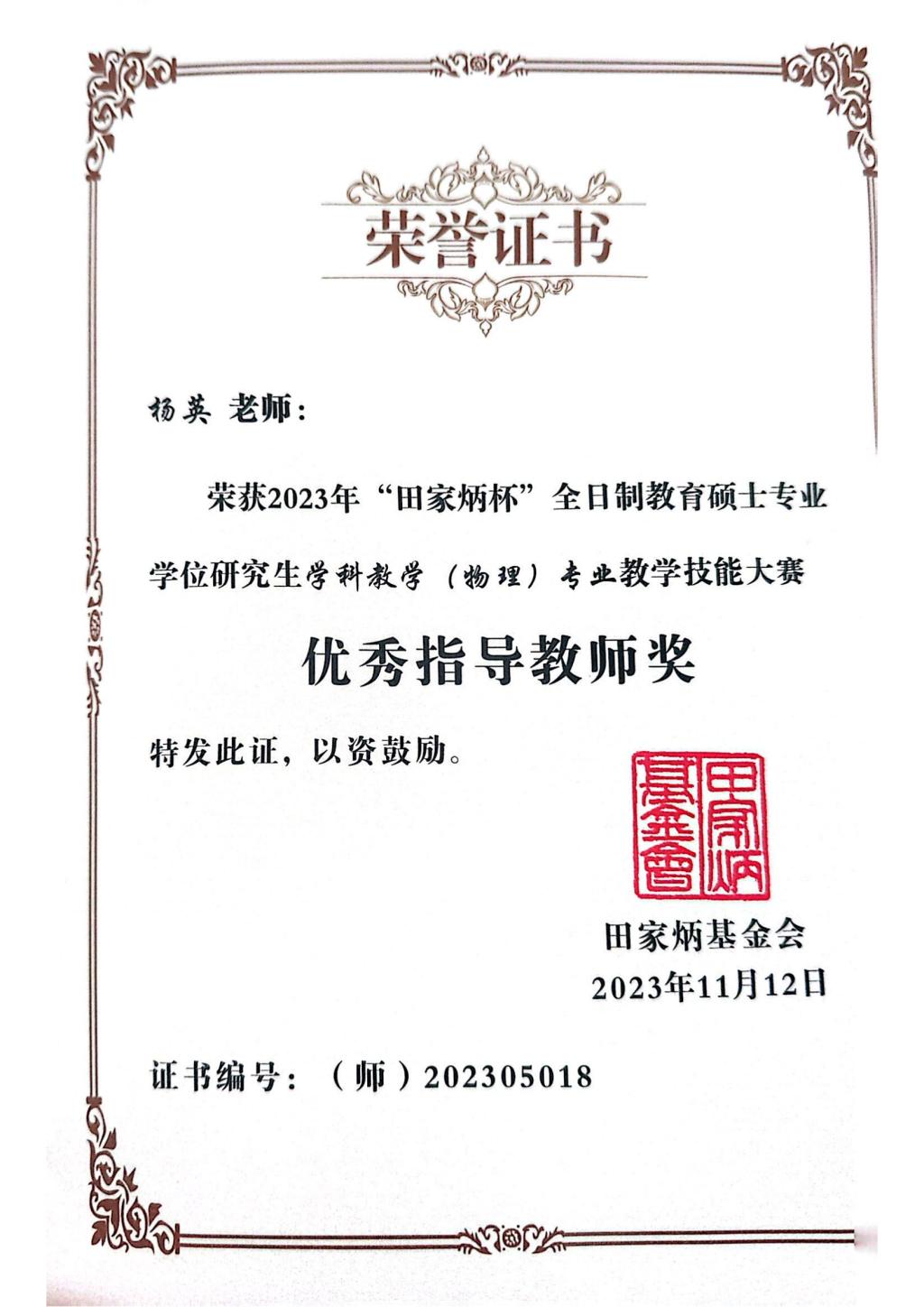 2022级学科教学(物理)专业硕士李盼、宋胜男分别荣获“一等奖”“二等奖”;杨英和岳远霞两位老师获得“优秀指导教师奖”。