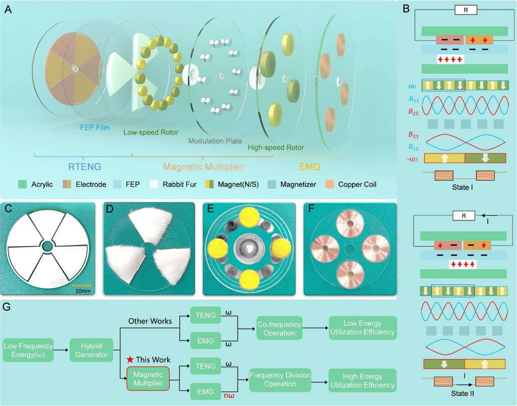 为第一单位,在国际顶级期刊《Research》(JCR1区,影响因子IF= 11.036,《Science》合作期刊)上发表有关摩擦纳米发电机的最新研究成果,题为“A Magnetic-Multiplier-Enabled Hybrid Generator with Frequency Division Operation and High Energy Utilization Efficiency”。