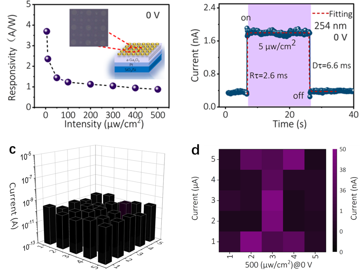 日盲深紫外光电探测器(PD)具有操作方便、易于制备和弱光灵敏度高等优点,在军事和民用领域应用前景广阔。本研究运用低成本的磁控溅射技术,制备出具有垂直结构的Pt/非晶Ga2O3/ITO日盲深紫外光电探测器。通过优化非晶Ga2O3层的制备工艺,该器件表现出卓越的日盲紫外探测性能。在3 V反向偏压下,该器件实现了671 A/W的高响应率、2.21×1015Jones的高探测率和27/11 ms的快速响应时间。更重要的是,在金属Pt和非晶氧化镓界面处的肖特基结的作用下,该器件能够在无需外部电源的条件下工作,具有自供电(自供能)的特性,经测试发现,该器件展现出卓越的自供电探测性能。在254 nm光照下具有3.69 A/W的超高响应率和2.6/6.6 ms的快速响应时间。这些研究结果优于迄今报道的大多数自供电型日盲深紫外光电探测器。最后,利用垂直结构便于制备大面积阵列器件的特点,本研究尝试制备了5*5的阵列探测器,并将其应用于日盲深紫外波段的成像。研究结果表明,Pt/a-Ga2O3/ITO紫外探测器在成像方面表现出色,在无需外部电源的条件就能清晰的成像,在日盲深紫外成像领域有广阔的应用前景。