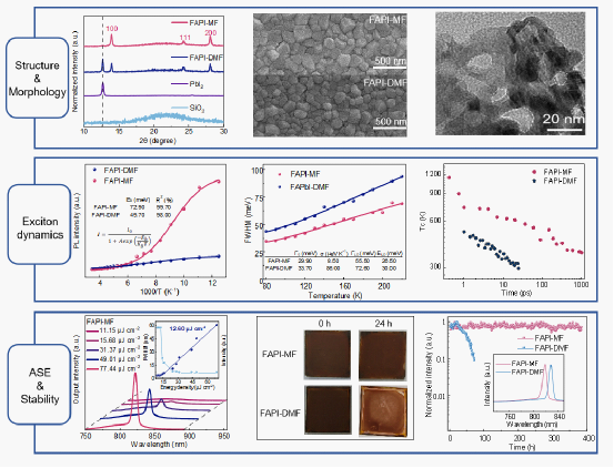 为了解决这一关键问题,研究团队创新性地从前驱体溶液化学的角度,提出了一种使用绿色环保的离子液---甲胺甲酸盐MAFa作为溶剂来制备黑相α-FAPbI₃薄膜的新方法。采用MAFa溶剂制备的薄膜在纳秒激光激发下表现出增强的近红外放大自发发射ASE性能以及更长的光学增益寿命,较高的激子结合能,激光阈值达到目前报道的纳秒激光激发的最低阈值。此外,使用离子液体制备的薄膜体现出优异的光稳定性和热稳定性方面的优势,并在连续激光测试中表现出优异的长期稳定性。