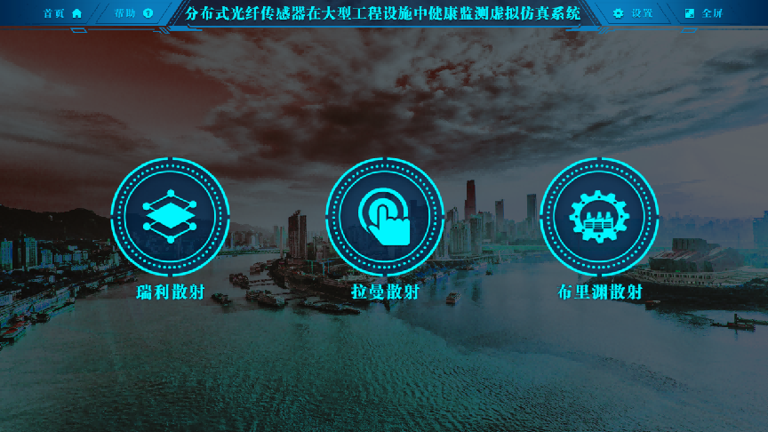 学习完毕后,进入实验选择环节,虚拟仿真实验平台分为三个环节,分别为“瑞利散射”和“拉曼散射”以及“布里渊散射”三个环节,用户可选任意环节进行实验以获得不同学习内容。
