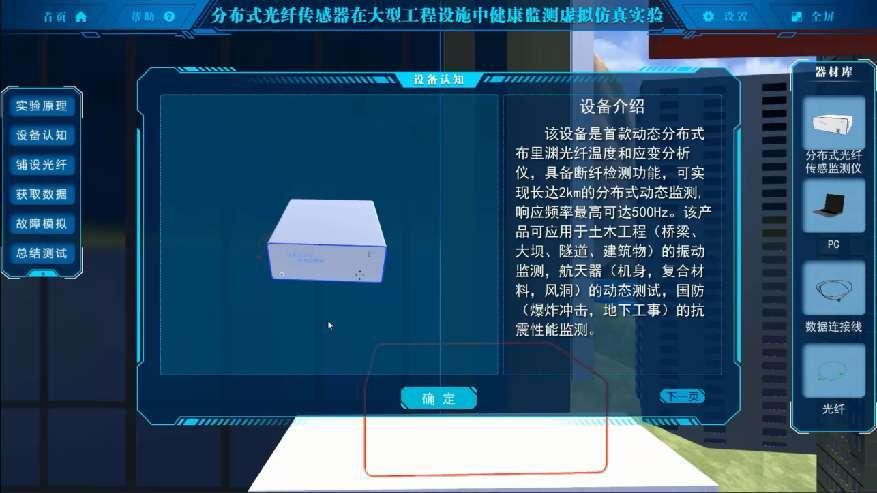 了解实验要求之后,准备开始实验,点击“开始实验”按钮正式进入“分布式光纤传感器在大型工程设施中的健康监测虚拟仿真系统”。