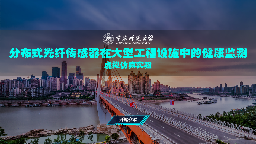 实验功能:实验选用重庆市核心区域——渝中半岛作为实验的整体场景,主体受监测建筑物为千厮门嘉陵江大桥,学生可在三维场景中自由漫游,同时学习实验背景、实验原理以及实验技术等内容,通过三维旋转认知实验各主要实验设备结构,学习设备参数及使用方式,包含分布式光纤传感监测仪、光纤、连接设备以及显示设备等,让学生亲历大型工程监测实践过程,实现“以虚代实”,将先进实验技术及时引入本科生实验教学,提高将专业理论知识应用于实践的能力。实验以光纤传感领域头部厂商的光纤传感监测设备作为模型构建基础,利用实际监测的数据作为依托,将真实的、准确的数据模型嵌入到虚拟仿真实验内,还原了现场勘查过程、光纤铺设过程、传感测试过程、数据采集过程、故障演练过程以及完整的数据分析过程,提供了随时、随地进行专业实践的机会,同时学生也体会如何根据实验内容和理论知识进行科学研究的方法。